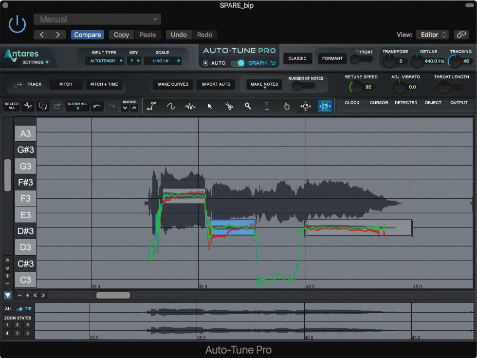 Melodyne works by detecting the pitch of the input signal and then creating representational blobs in a graphic editor, sort of like MIDI notes in a piano roll. You can then adjust the pitch and timing of the blobs as you would MIDI notes. You can also adjust each note’s modulation, pitch drift, amplitude, formants, sibilance, and more.