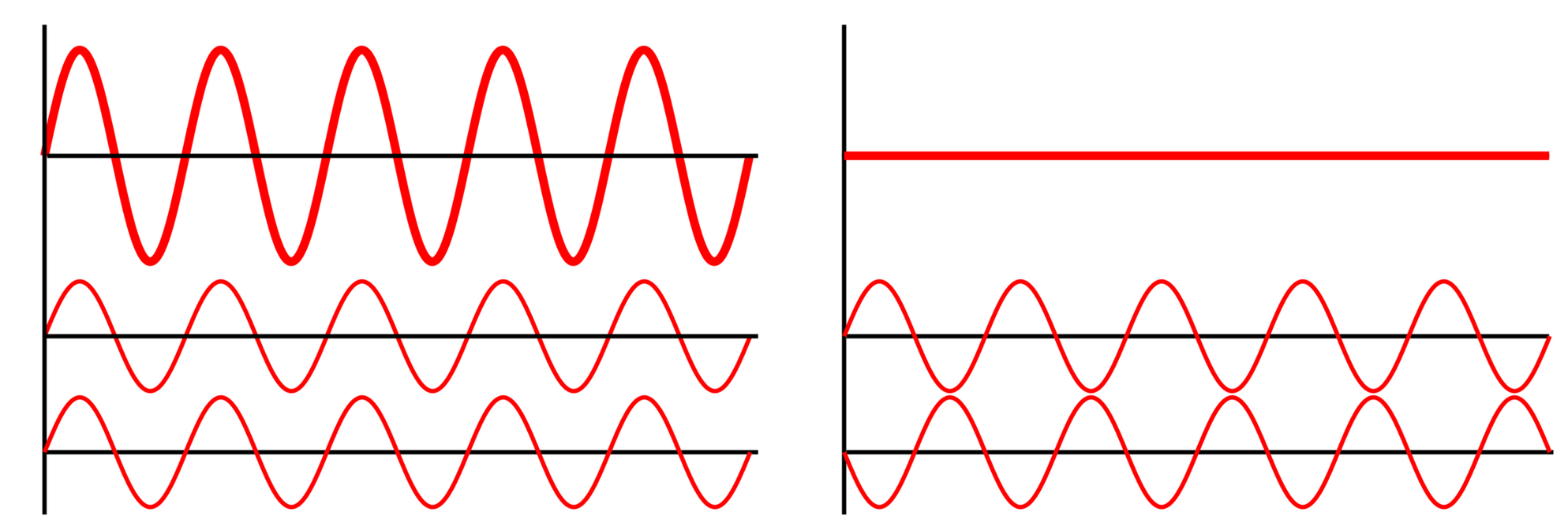 With sound waves and interference covered, it’s time to talk about why a note on the guitar sounds different from the same note on the French horn. Introducing…(drum roll, please)...the harmonic series!In music, the harmonic series is responsible for the unique tone and timbre of different instruments, objects, and voices. It’s a pattern that all natural sounds follow. Let’s say we pluck a string, and it produces a sound. When the string is plucked, it vibrates at a certain fundamental frequency. However, it simultaneously produces vibrations (pure sine waves) that are twice as fast, three times as fast, four times as fast, and so on. These multiples of the fundamental frequency are called harmonics. If the sound’s fundamental frequency is 100 Hz, the second harmonic would be 200 Hz, the third harmonic would be 300 Hz, the fourth harmonic would be 400 Hz, and so on. Through interference, the fundamental frequency and the harmonics interact to create a unique sound.